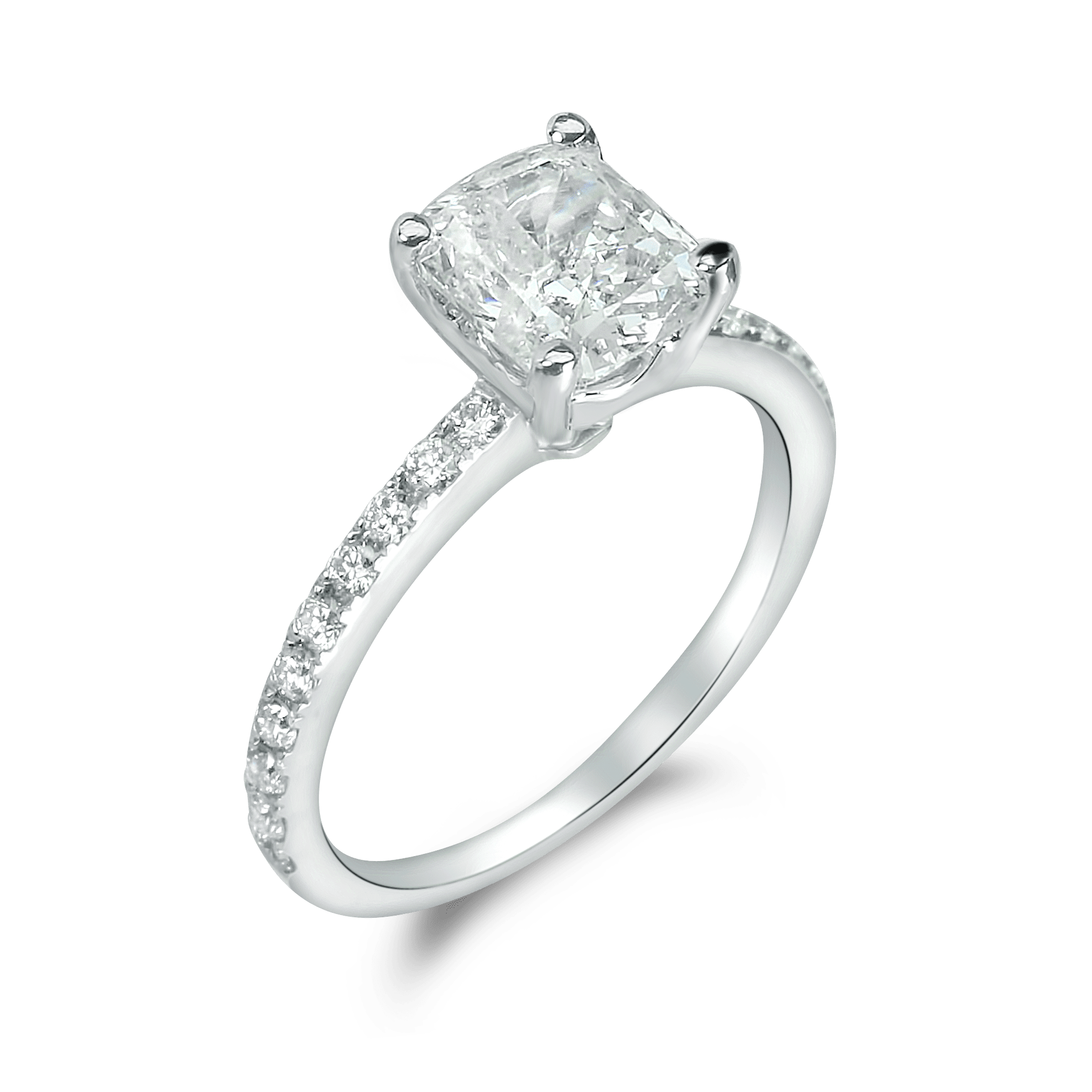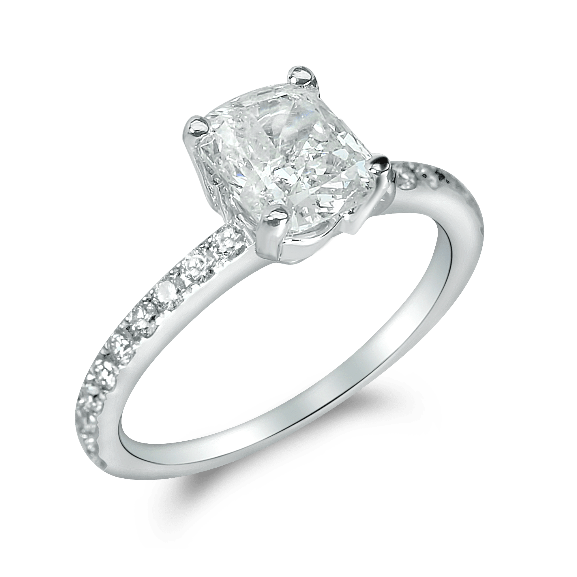 18k exquisitely hand crafted White gold setting with round micro pave diamonds paired with a beautiful cushion center diamond.