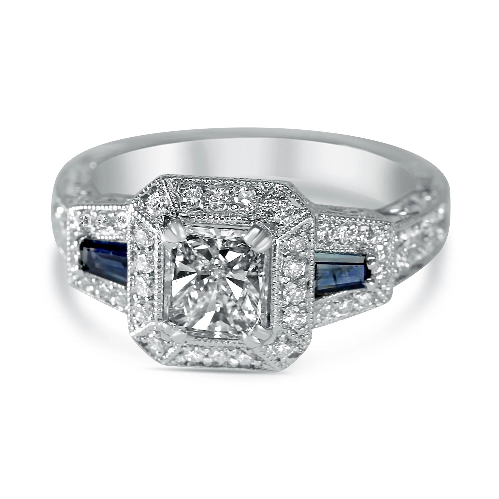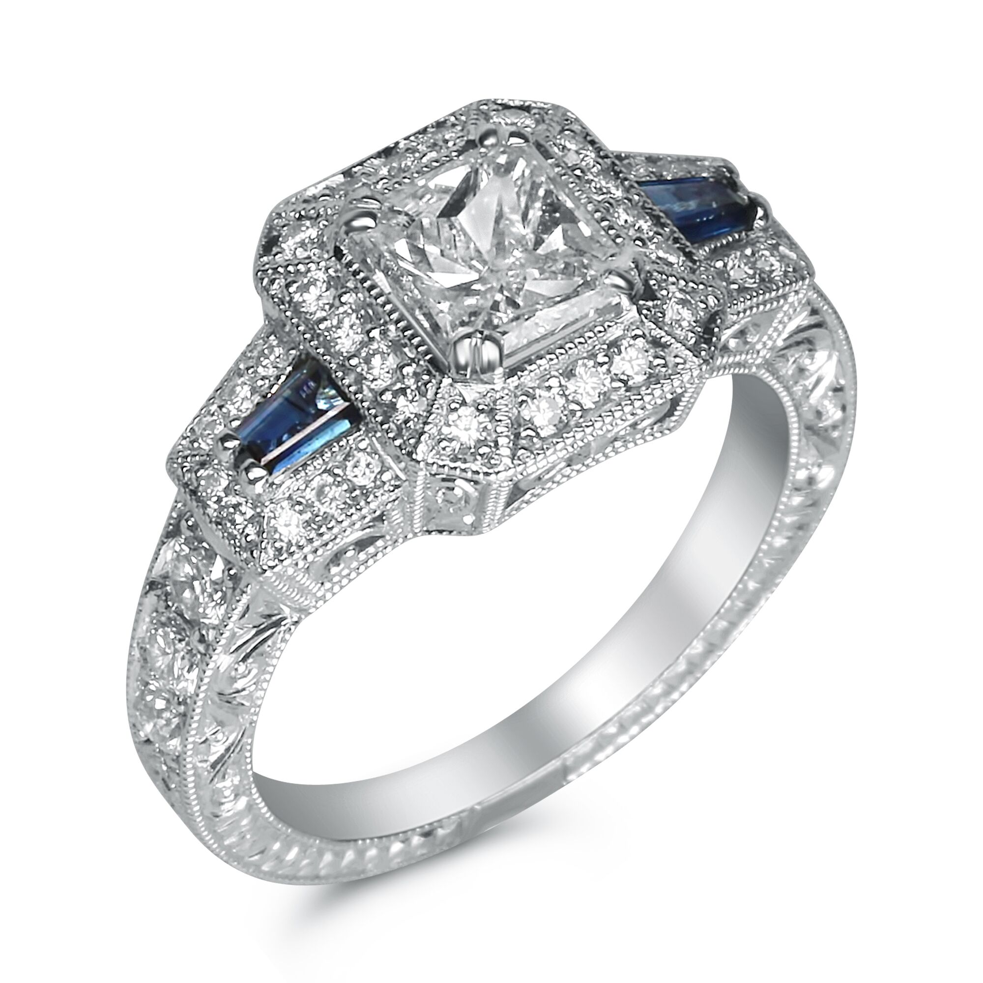Antique Princess Halo with Blue Sapphire Sides, Millgrain and Hand Engraved