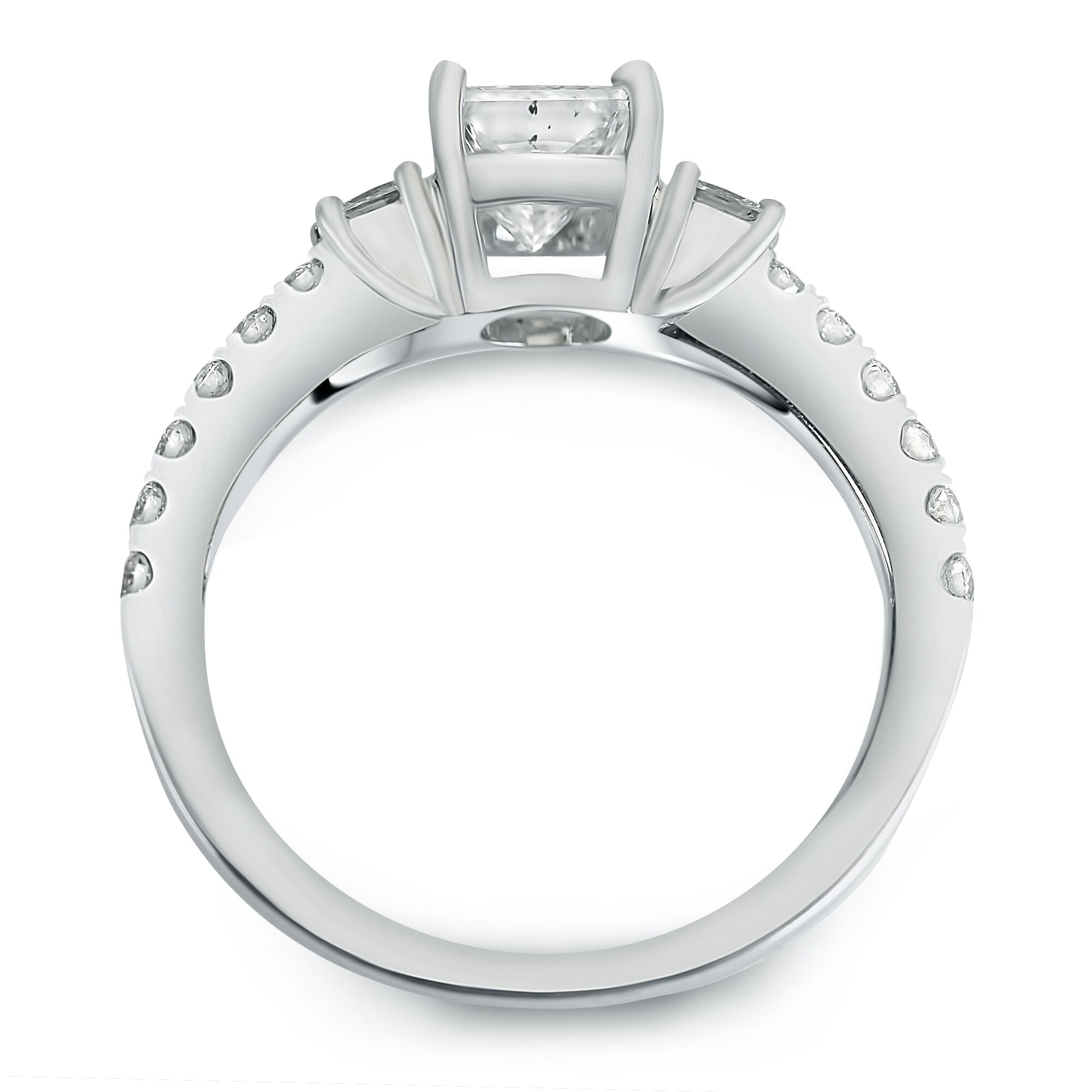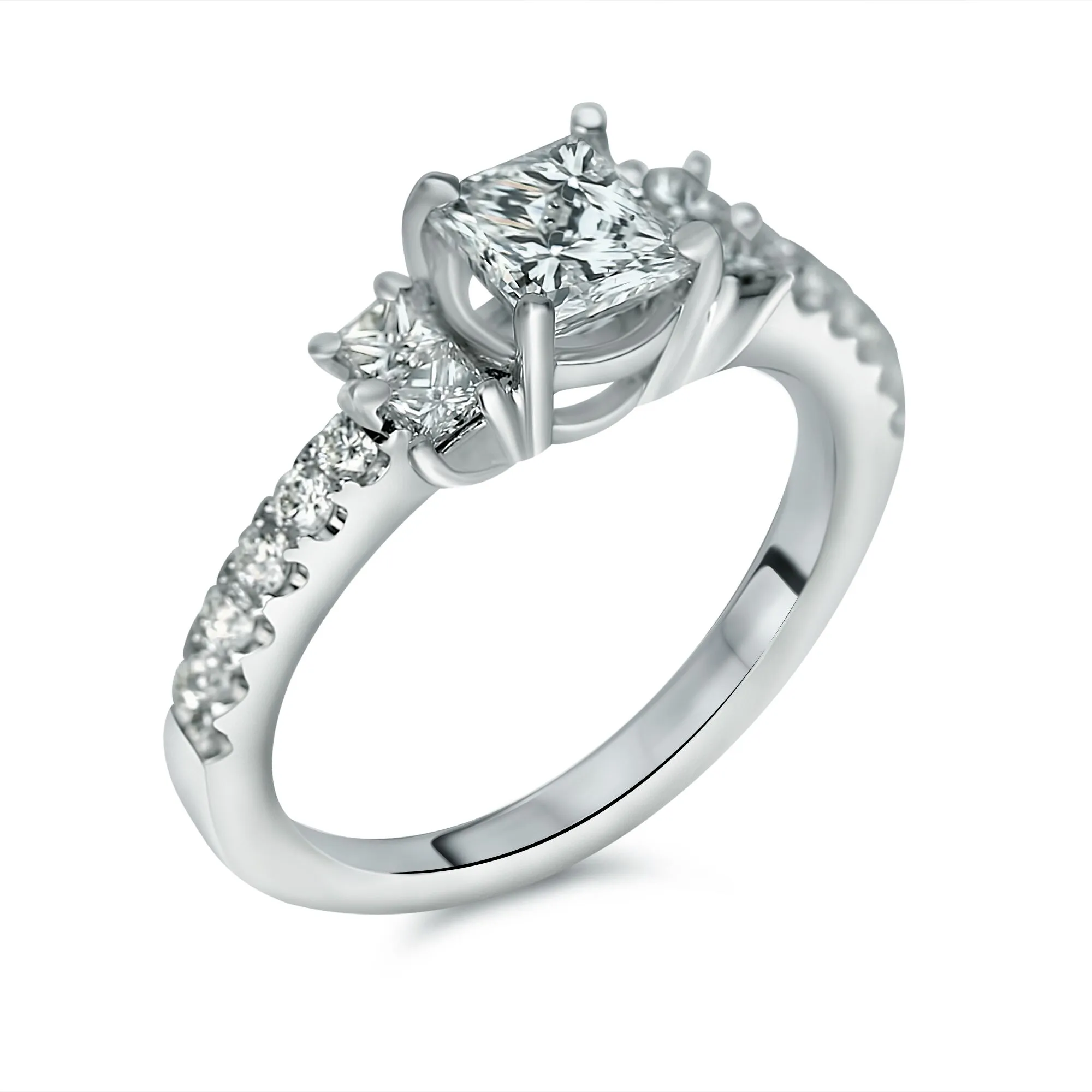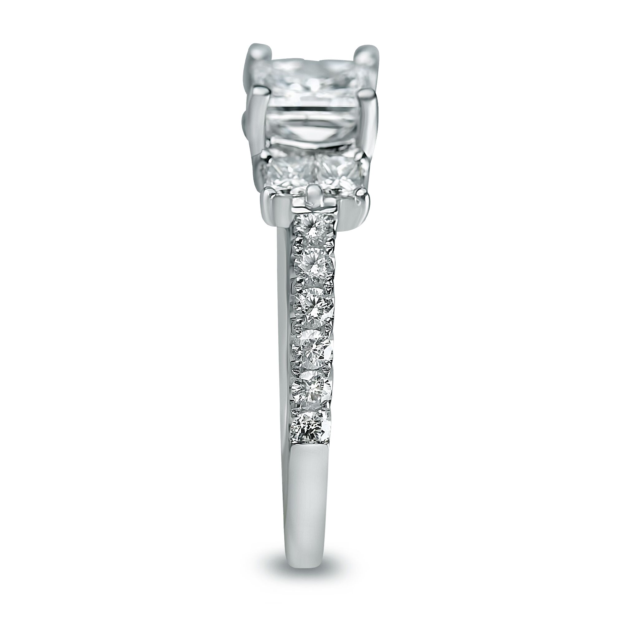 1 1/4cttw Three Stone Shared Prong Ring with Princess Cut Center Diamond